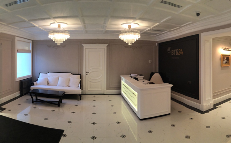 В кабинетах встроены функциональные системы шкафов в примыкание со стеновыми панелями. Интересное решение выполнено с ткани Алькантара с глубокими нишами под